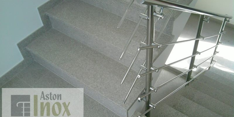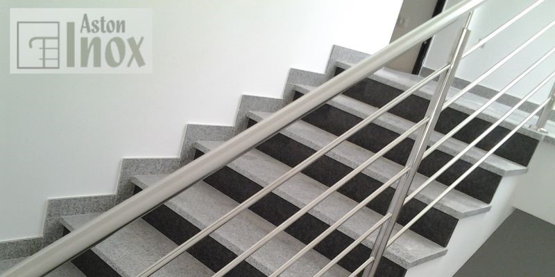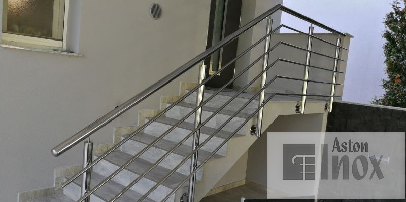 Inox ograda za stepenice / stubišta sa horizontalnim ispunama. Legenda među ogradama. Ova inox ograda ima okrugle rukohvate i stupove jednakog promjera i 4-5 tanjih, horizontalnih inox ispuna paralelnih sa rukohvatom koje idu između stupova. Završna obrada inox-a može biti polirano (sjaj) ili brušeno(mat).